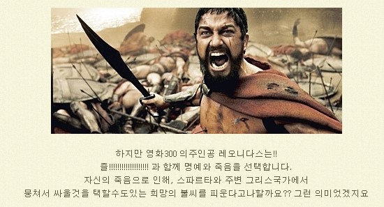 1) 인류 역사상 가장 도전적 상황에서 [300명의 정예군]만이 투입되어 1백만명을 상대함 (1대 3.333 명의 싸움)